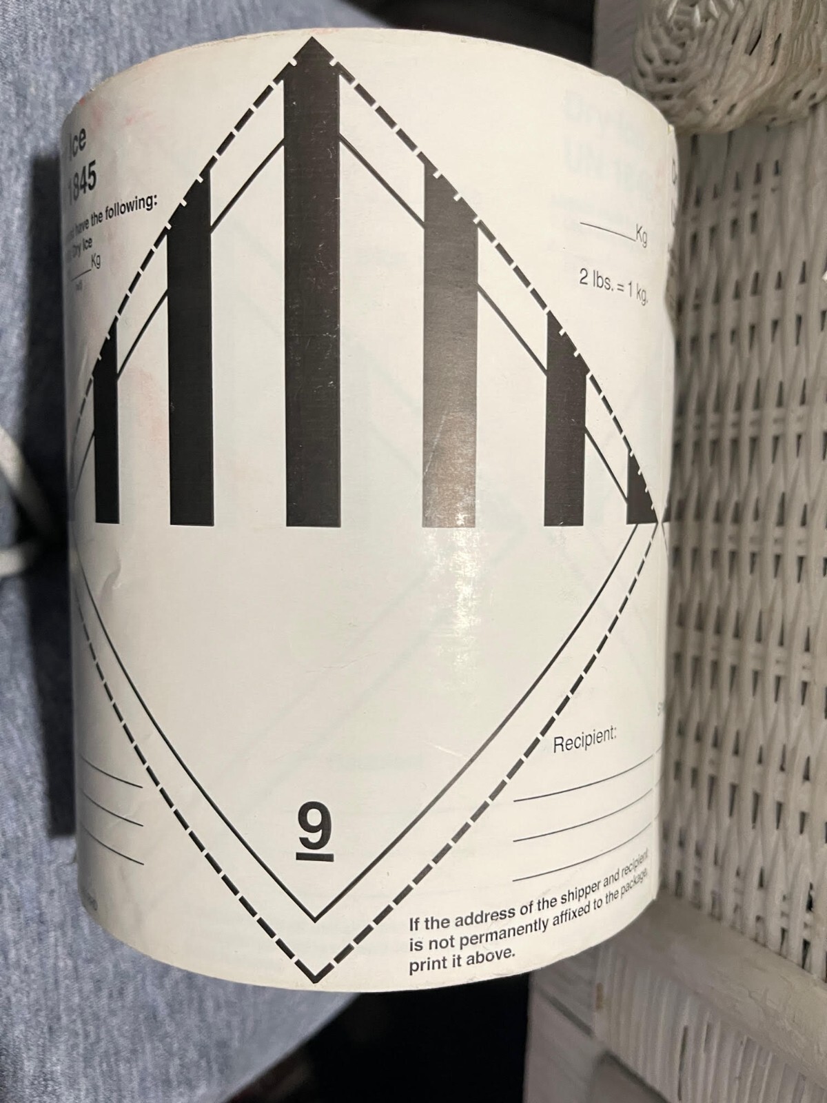 Printable Dry Ice Shipping Label The label below should print ... Printable Dry Ice Shipping Label The label below should print with the proper dimensions of a class 9 hazard label (minimum dimensions: 100 mm on a side). Cut around the outside border of the label and affix it a vertical side of the box (not the top or bottom), oriented as shown below. Changes to Dry Ice “Class 9” Shipping Markings & Label Required Markings for Dry Ice: 1. Class 9 Miscellaneous Hazard Label 2. Proper shipping name and UN ID Number: “Carbon dioxide, solid” or “Dry ice” and UN1845 3. Net quantity of dry ice . UN 1845 Marking Requirements: • Packages that have greater than 30 kg (66 lbs.) of dry ice require a 12mm type face or larger for